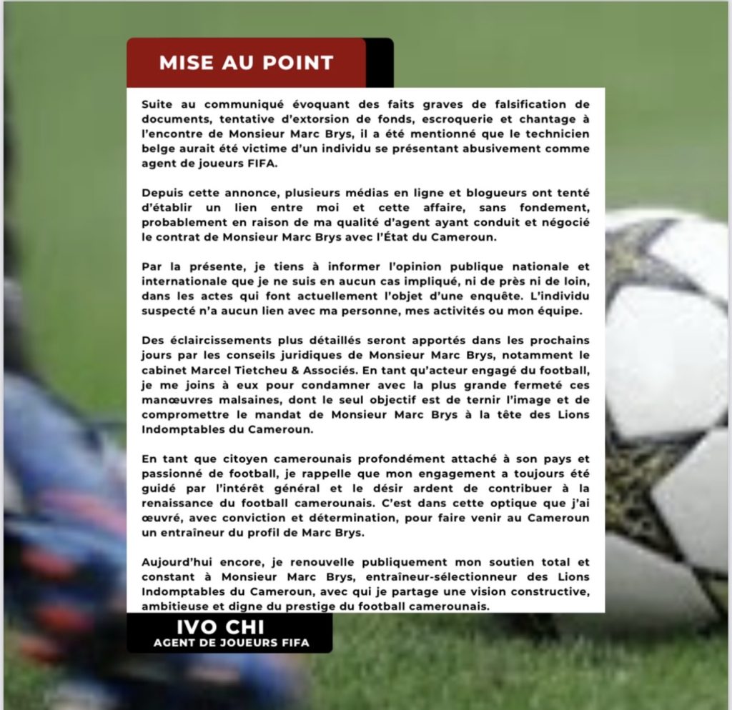 Ivo Chi a exprimé son soutien total et constant à Marc Brys, affirmant qu’il partage une vision constructive et ambitieuse pour le football camerounais. Il a également condamné avec fermeté les manœuvres malsaines visant à ternir l’image de Marc Brys et à compromettre son mandat à la tête des Lions Indomptables du Cameroun.